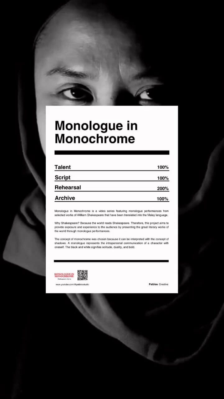 MiM serba putihitam, sesuai mengekor temanya yang monokrom. Ia adalah video persembahan monolog daripada skrip-skrip Shakespeare yang diterjemahkan ke dalam bahasa Melayu oleh pelakon-pelakon teater yang sedia ada.