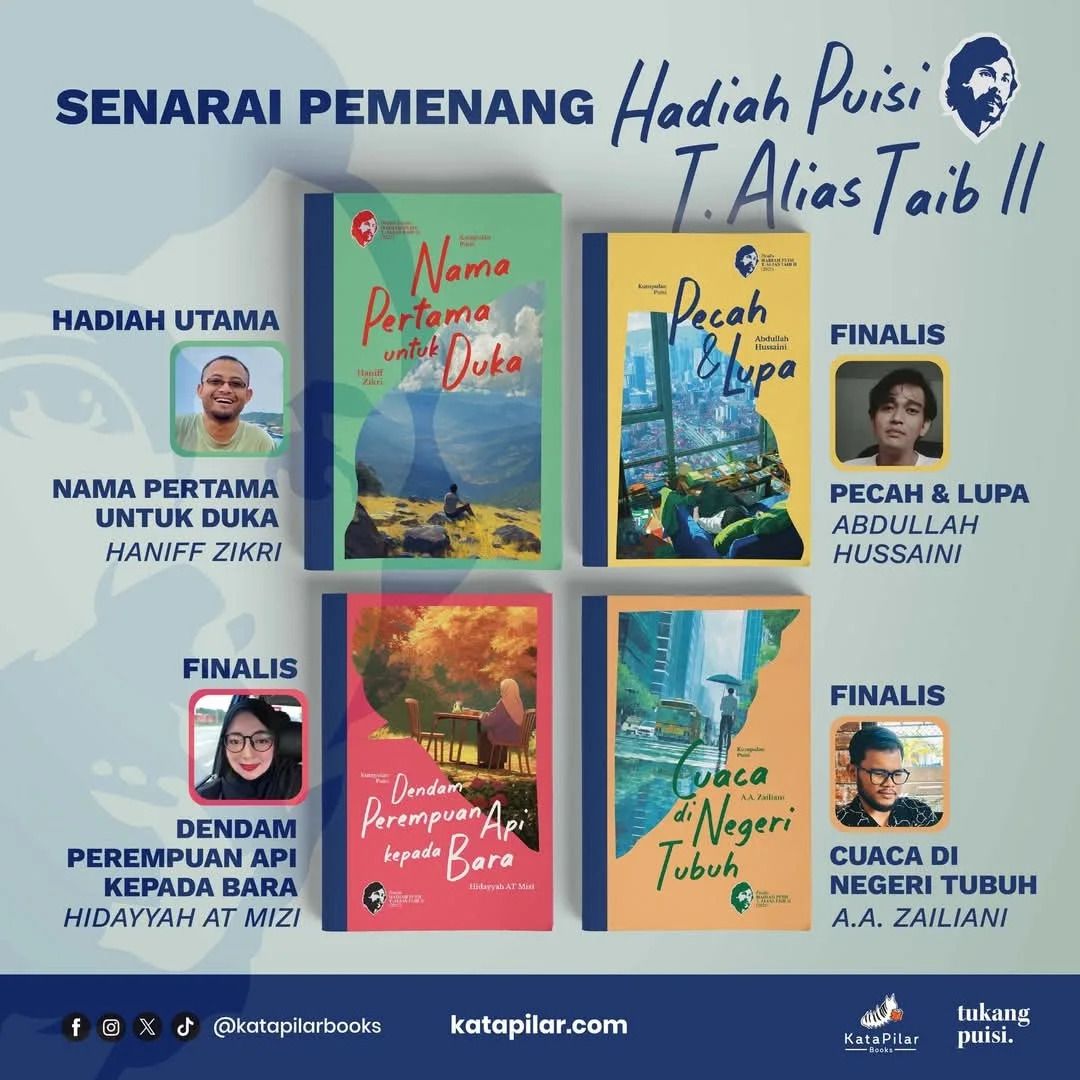 9 Mei lepas, 4 pemenang telah diumumkan dan menariknya, kalau kita cantum keempat-empat cover buku ini, ia akan membentuk wajah T. Alias Taib, seorang penulis yang penting dalam mencorak semangat puisi Malaysia.